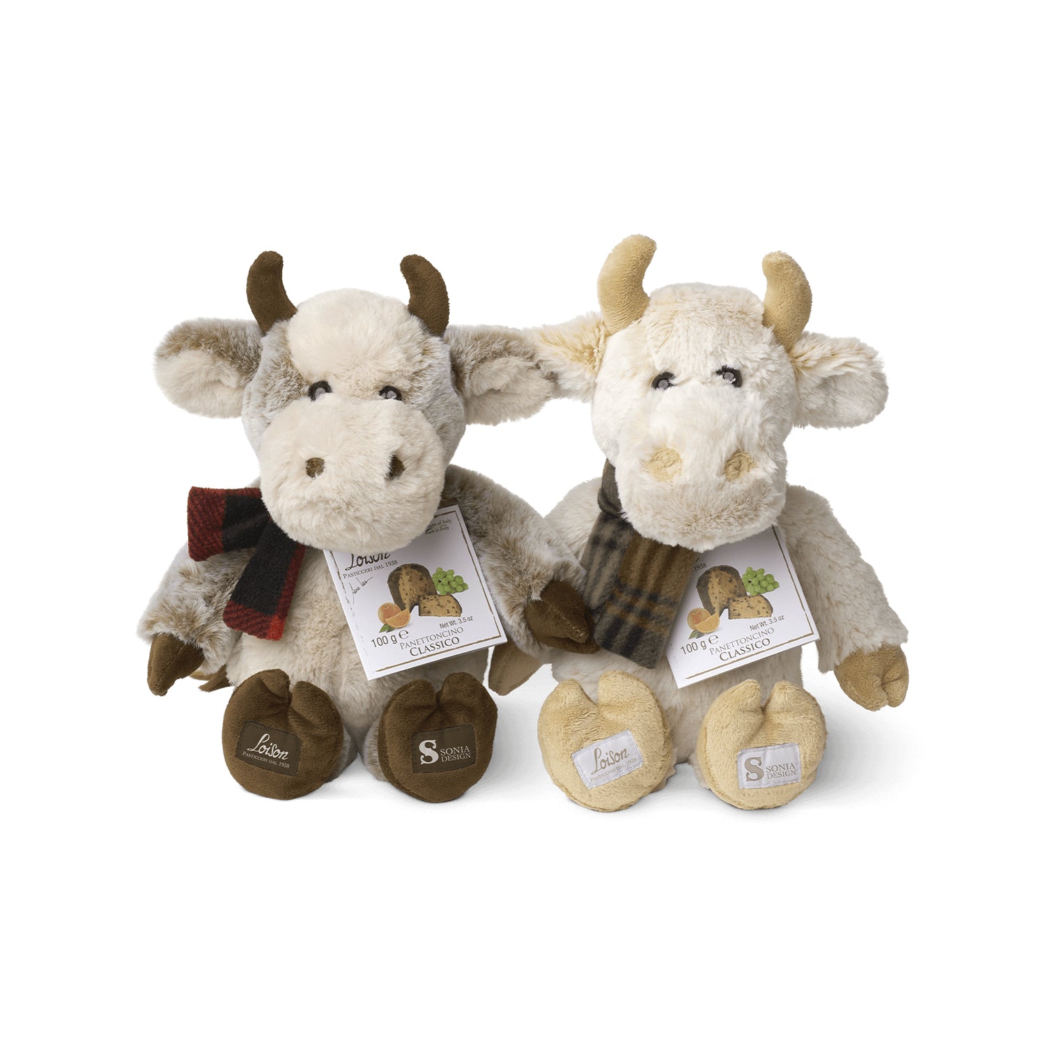 The Classic Mini Panettone in the small 100g format, hand-packaged inside an adorable plush toy. The plush toys are available in two color variants, making a cuddly gift for both adults and children.