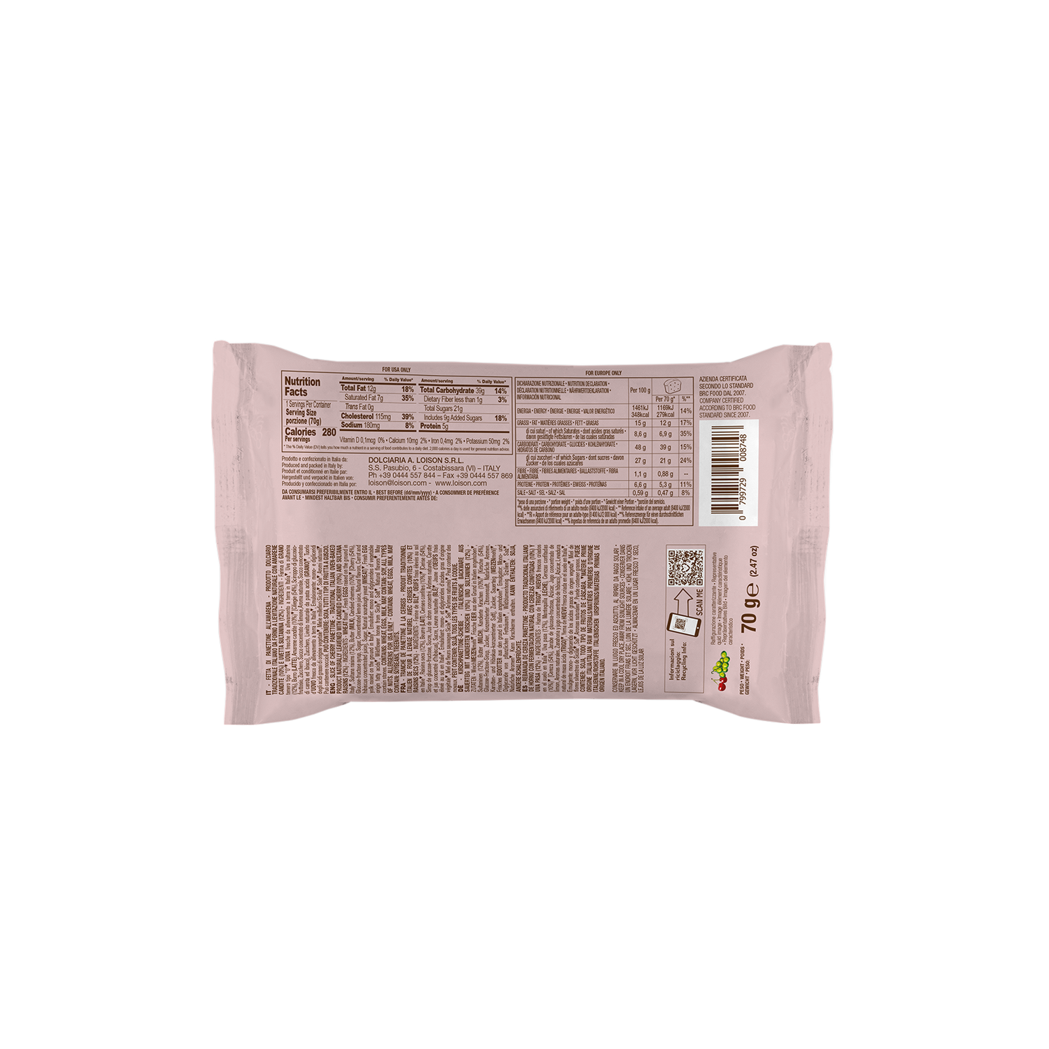 The cherry sliced panettone is intended to add a touch of refined sweetness to daily breakfast but also manages to be a surprise in a savoury version for brunch and in other creative combinations. Sliced panettone is a loaf-shaped cake, naturally leavened sourdough, cut into slices and packaged in practical single portions. The yellow soft and well-alveolated sponge is enriched with Sicilian orange peel, Diamante citron from Calabria and sultanas.